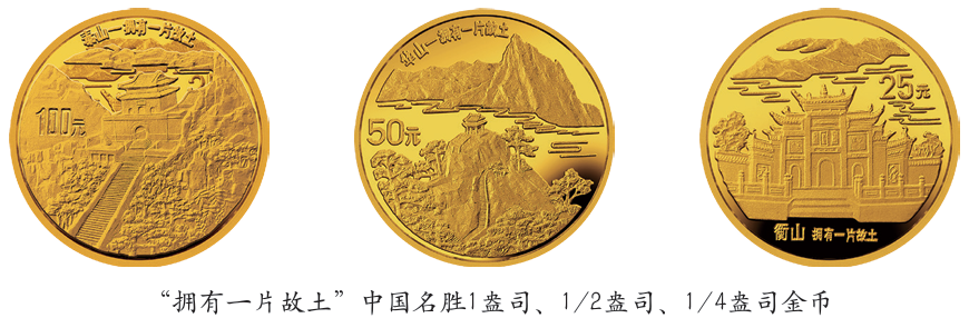 1993年“拥有一片故土”中国名胜金银币中的1盎司金币展现的是“会当凌绝顶,一览众山小”的东岳泰山。1/2盎司金币是险居五岳之首,令人望山咏叹“谁将倚天剑,削出倚天峰”的西岳华山。金币上的图案既是对自然景色的刻画,也是对天人合一的表达。1/4盎司金币是“五岳独秀”的南岳衡山。金币画面表现的是南岳衡山的必经入口——南岳牌坊。唐宋以来,一众鸿儒巨学持续在衡山讲学论经,吟诗作赋,留下了无数宝墨诗篇,成就了南岳“文明奥区”之盛名。他们的足迹,都从南岳牌坊下开始。1/10盎司金币和1/20盎司金币分别展示北岳恒山与中国最早的高空建筑——北魏嵩山寺塔。