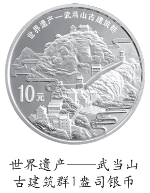2010年发行的世界遗产——武当山古建筑群金银币中的1盎司银币,币面远景的武当山秀奇峻拔,近景重檐庑殿,观殿重重,充分展示了武当山古建筑在设计上绝妙利用地形的建筑特点,共同演绎着天道合一、天人合一的人间胜景。