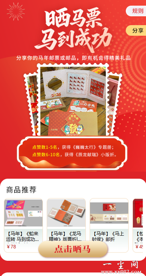 参与“晒马票 马到成功”话题互动,用户分享购买的马年邮票或邮品,点赞前10名可获得精美礼品,包括《巍巍太行》专题册或《辰龙献瑞》小版折。