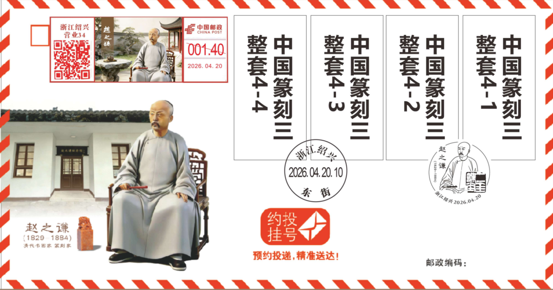 中国邮政将于2026年4月20日发行《中国篆刻》(三)邮票一套4枚,其中一枚邮票图案为赵之谦所制二金蝶堂印。赵之谦是浙江会稽(今绍兴)人,清代著名书画家、篆刻家。经中国邮政集团有限公司批准,浙江省绍兴市邮政分公司将于2026年4月20日启用“赵之谦”彩色数字打印型邮资机戳一枚。为方便大家收藏,《集邮》杂志微店上架了相关实寄邮品。挂号实寄封使用美术封为载体,加贴“二金蝶堂”邮票1枚,使用“赵之谦”彩色数字打印型邮资机戳补资,盖销“赵之谦”文化日戳及浙江绍兴东街邮政日戳,挂号实寄给预订者。识别上方二维码即可预订。约投挂号实寄封使用美术约投封为载体,加贴《中国篆刻》(三)邮票1套4枚,使用“赵之谦”彩色数字打印型邮资机戳补资,盖销“赵之谦”文化日戳及浙江绍兴东街邮政日戳,约投挂号实寄给预订者。识别上方二维码即可预订。包含1片2封,实寄明信片使用美术明信片为载体,随机加贴《中国篆刻》(三)邮票1枚;挂号实寄封使用美术封为载体,加贴“二金蝶堂”邮票1枚;约投挂号实寄封使用美术约投封为载体,随机加贴《中国篆刻》(三)邮票2枚,均使用“赵之谦”彩色数字打印型邮资机戳补资,盖销“赵之谦”文化日戳及浙江绍兴东街邮政日戳,实寄给预订者。识别上方二维码即可预订。