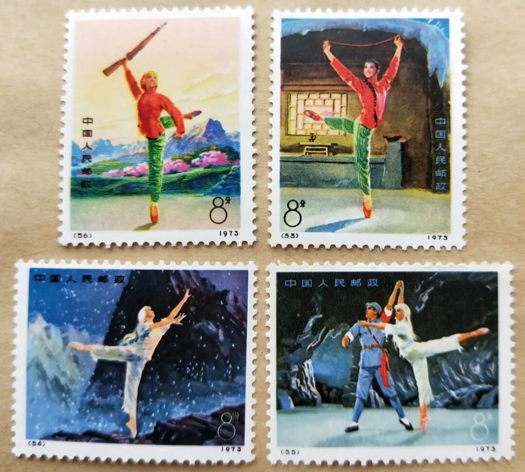 编号53-56《革命现代舞剧白毛女》邮票,是1973年9月25日发行的4枚套票,由尹定邦、杨白子设计,北京邮票厂印制,总面值仅0.32元。