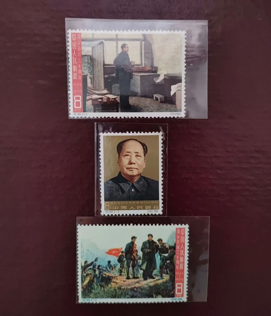 1965年1月31日,邮电部发行了一套名为《遵义会议三十周年》的纪念邮票,编号纪109,全套共3枚,面值各8分,发行量均为1000万套,由新中国邮票设计大家刘硕仁操刀。三枚邮票分别是“决战前夕”、“毛主席像”和“娄山关大捷”,分别记录了长征途中最关键的三个历史瞬间。