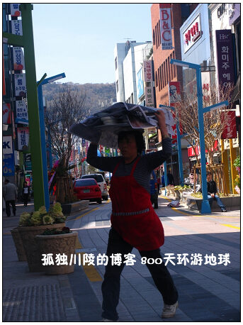 北京在很多年以前就不允许平板车上大街了,然而在韩国市区中心的马路上,大白天还能出现收旧货的人力车,拉着旧货满街跑,这多少有些雷人。图片远端的高楼是韩国市中心的大厦。