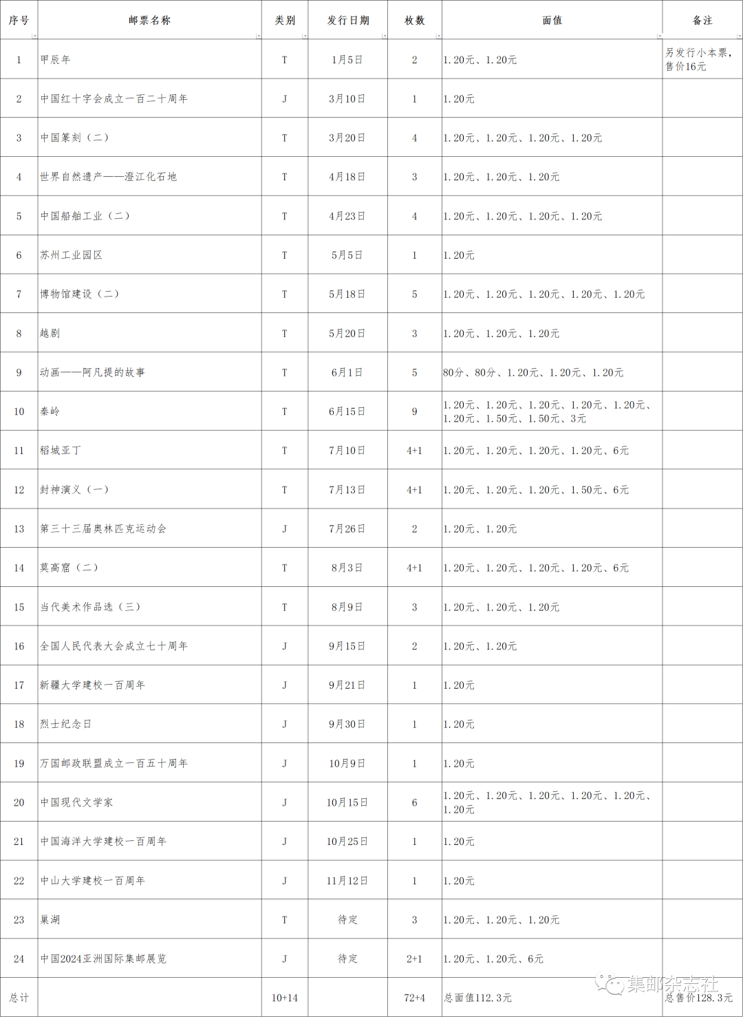 日前,经国家邮政局审定,2024年纪特邮票发行计划(第一批)共24套,其中纪念邮票10套,特种邮票14套。详情如下。