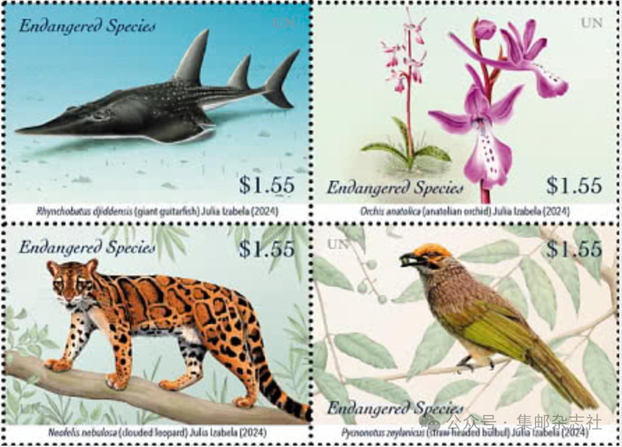 4月26日,联合国邮政发行2024年“濒危物种”邮票一套12枚。图案分别为及达尖犁头鳐、兰花、云豹、皇冠鹎、伊泰吐巴河江魟、沉香、骆马、尖吻鲸鲨、路氏双髻鲨、蜂兰属植物、原驼、白腰鹊鸲。该套邮票由茱莉亚·伊扎贝拉设计。