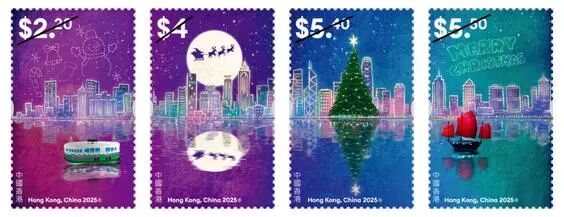 11月25日,香港邮政将发行《圣诞邮票V》特别邮票一套4枚,面值分别为2.20元、4元、5.40元、5.50元,同时推出小全张1枚。邮票设计为李嘉朗。邮票以维港夜景为背景,在星空下呈现各式各样的圣诞元素和节日的欢乐。