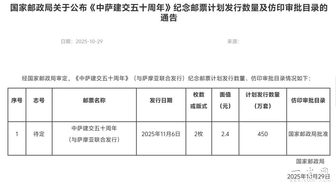 11月新邮发行量公布