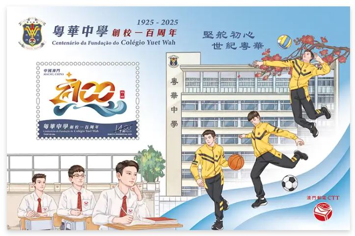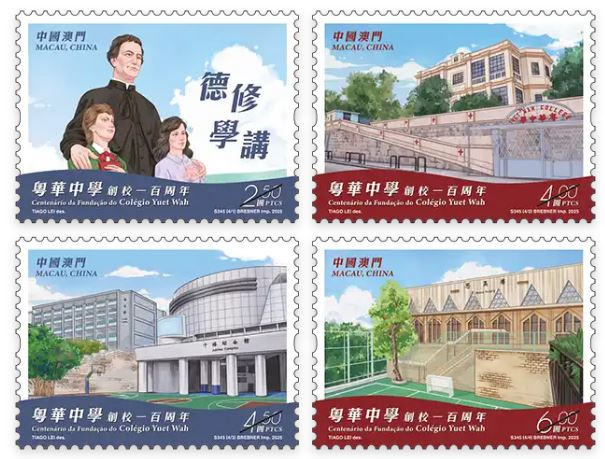 澳门邮政局将于2025年12月8日发行《粤华中学创校一百周年》邮票一套4枚,面值分别为:2.50元、4.00元、4.50元、6.00元。同时推出小型张一枚,面值分别为:14元。以写实手法展现校园景观。