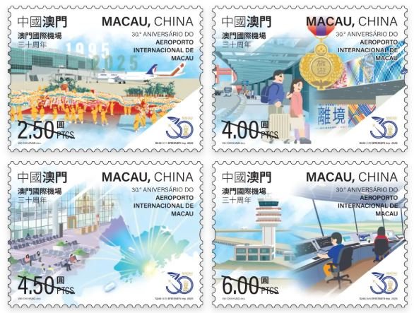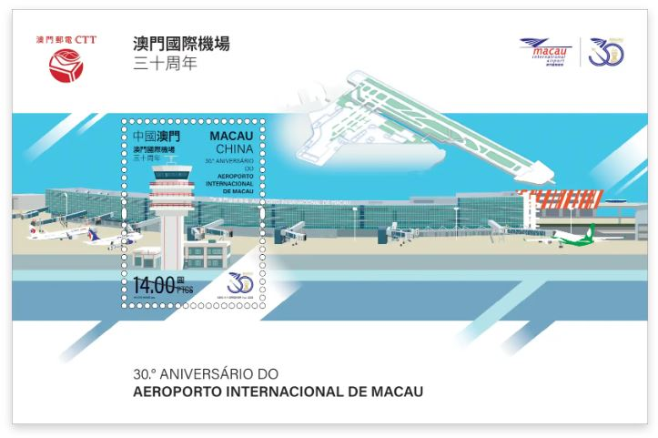 澳门邮政局将于2025年12月8日发行《澳门国际机场三十周年》邮票一套4枚,面值分别为:2.50元、4.00元、4.50元、6.00元。同时推出小型张一枚,面值分别为:14元。