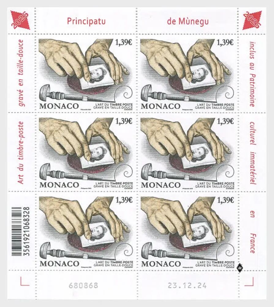 11月6日,摩纳哥邮政发行1枚《邮票凹版雕刻艺术》邮票,图案为一双正在雕刻邮票凹版母模的手及一把雕刻刀,面值1.39欧元。