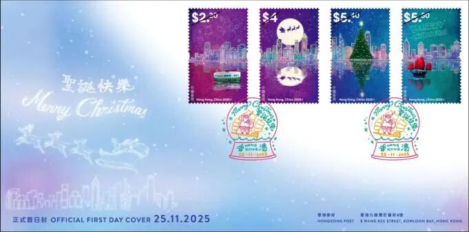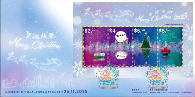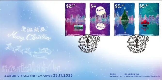 香港邮政于2025年11月25日发行《圣诞邮票V》特别邮票一套4枚,面值分别为2.20元、4元、5.40元、5.50元,同时推出小全张一枚。邮票设计为李嘉朗。