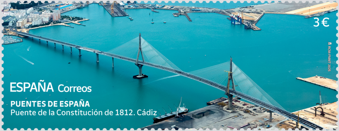 《西班牙桥梁:1812年宪法桥》邮票1套1枚,该枚邮票邮票的横向票幅达到74.60毫米。位于加的斯的“宪法桥”是一座横跨加的斯湾的斜拉桥,是西班牙交通部近年来所承担的最为独特、规模最大且最为复杂的工程之一。它构成了从大陆进入加的斯市的第三条通道,全长3092米,拥有34个桥墩和两座桥塔,其中9个桥墩和1座桥塔位于海中。此外,它是世界上垂直净空(桥面距水面的高度)第二大的海上桥梁,仅次于纽约的韦拉札诺海峡大桥,而高于旧金山的金门大桥。