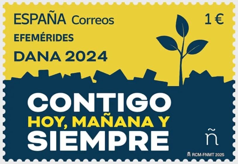 10月29日,发行《纪念事件系列:2024年丹娜丝风暴》邮票1套1枚,纪念2024年10月袭击瓦伦西亚及其东部沿海地区的孤立性高空低气压(DANA)风暴。该破坏性气象事件造成巨额财产损失,遇难人数达237人,使之成为西班牙当代最严重的危机事件之一。在灾难面前,西班牙居民、志愿者及各组织展现出非凡的团结精神与奉献意识,他们携手共克时艰,为最需要帮助的人们提供支持。邮票上印有“与你同在,无论今昔永恒”的标语,缅怀遇难者并寄托哀思。