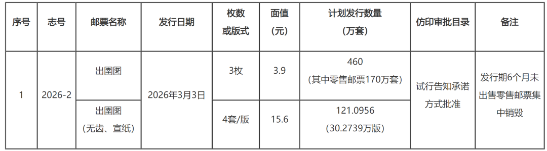 国家邮政局关于公布《出圉图》特种邮票计划发行数量及仿印审批目录的通告
