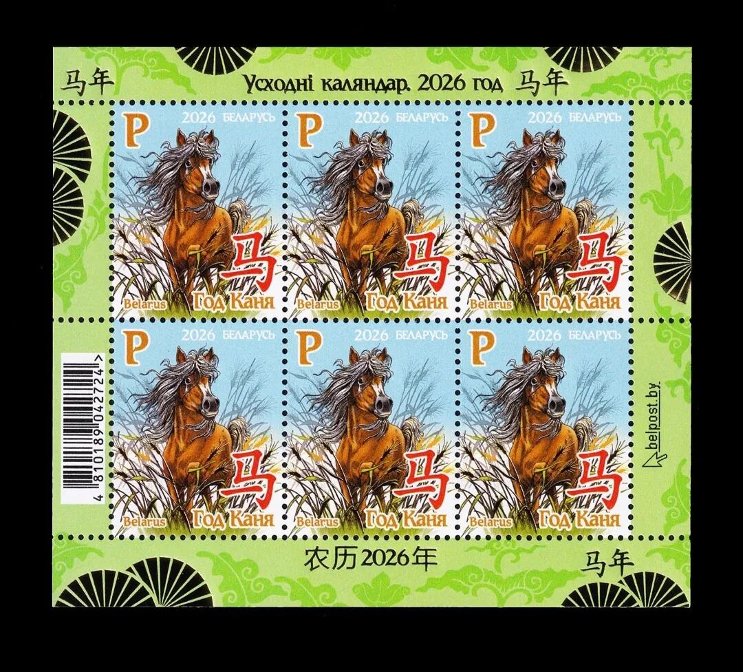 2月10日,白俄罗斯发行“东方历法:马年”生肖邮票1枚。该邮票项目由白俄罗斯国立大学孔子学院提供协助,图案表现了奔跑的骏马以及汉字“马”。