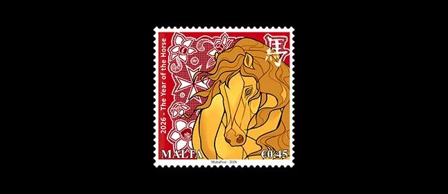 2月9日,马耳他发行了马年生肖邮票一套2枚,面值分别为0.45欧元和1.91欧元。其中,0.45欧元面值的邮票由马耳他本土设计师玛丽亚·克里斯蒂娜·布格亚(Maria Christina Bugeja)设计,这枚邮票描绘了一匹强壮的金色马匹,传统中国文化元素体现在马匹的动感姿态以及右上角的汉字“马”字。马耳他身份通过显著的马耳他十字、精致的蕾丝图案和水仙花融入邮票设计中。