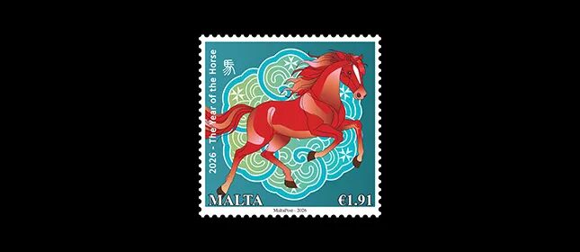 1.91欧元面值邮票由中国设计师方军设计。这枚邮票描绘了一匹强壮的红棕色马,头部高昂,鬃毛和尾巴随风自由飞舞,蹄子离地,传达出一种能量和不可阻挡的精神。它以吉祥的云朵图案为背景,并配有马耳他十字,邮票左上角展示了汉字“马”。