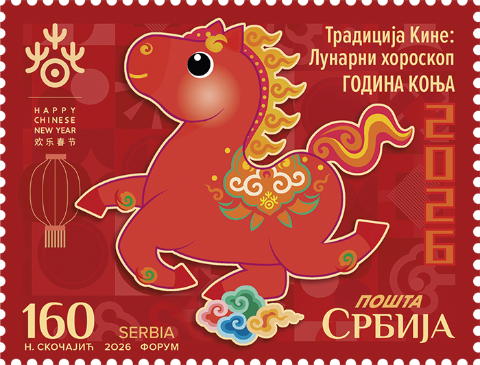 2月12日,塞尔维亚发行马年生肖邮票1枚。该邮票由贝尔格莱德中国文化中心提供协助,图案采用了中华人民共和国文化和旅游部2026年“欢乐春节”吉祥物“吉祥马”的形象。