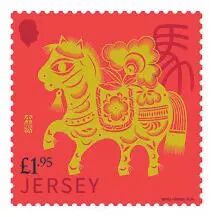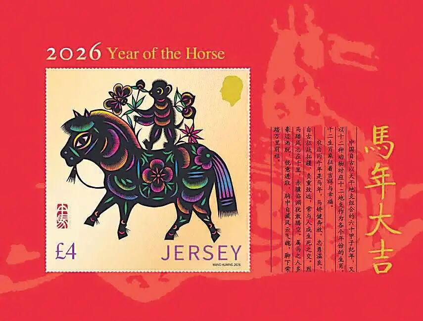泽西岛于1月27日发行2026农历马年新年邮票和小型张各1枚,由中国邮票设计师王虎鸣设计。泽西岛邮政自2016年开始发行生肖邮票,本轮设计均采用中国传统绘画和剪纸艺术风格。邮票上的金色骏马在红底色的衬托下极具视觉冲击力,马身的花纹、鬃毛采用剪纸的镂空与线条技法,右侧的篆体“马”字与左侧的生肖印章呼应。