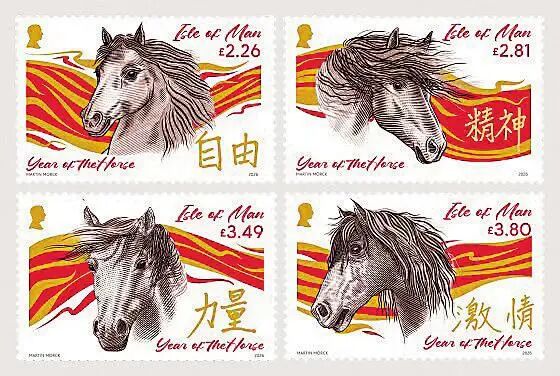 马恩岛于1月20日发行生肖邮票1套4枚。邮票图案以钢笔画描绘马的头部,背景搭配红黄渐变的流动线条,既呼应中国春节的喜庆氛围,也烘托了骏马奔腾的活力动感。4枚邮票分别印有“自由”“精神”“力量”“激情”汉字,诠释了马在中国文化中象征的昂扬奋进、自强不息的精神内核,传递了对新年的美好期许。这套邮票由国际雕刻师马丁·莫克设计。邮票发行收入将用于支持马恩岛残疾人骑马协会及残疾人马车驾驶项目等慈善事业。
