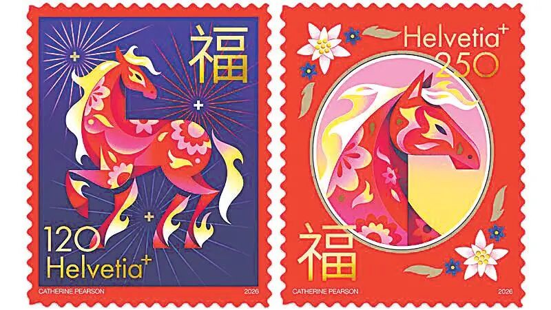 瑞士于1月22日发行马年生肖邮票1套2枚,并发行灯笼造型的小版张。邮票图案紧扣“火马年”主题,以金色与红色为主色调,突出骏马形象,邮票上还印有醒目的中文“福”字,表达了对中国农历新年的美好祝愿。