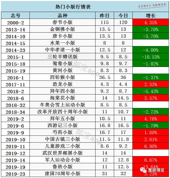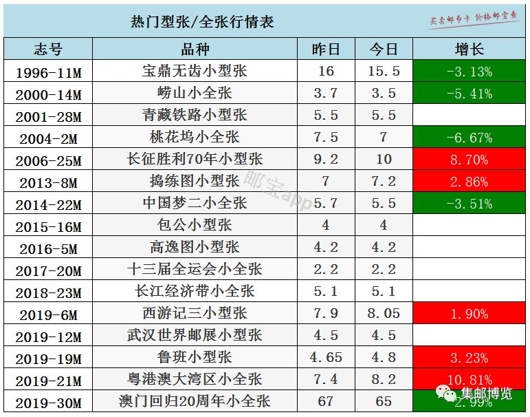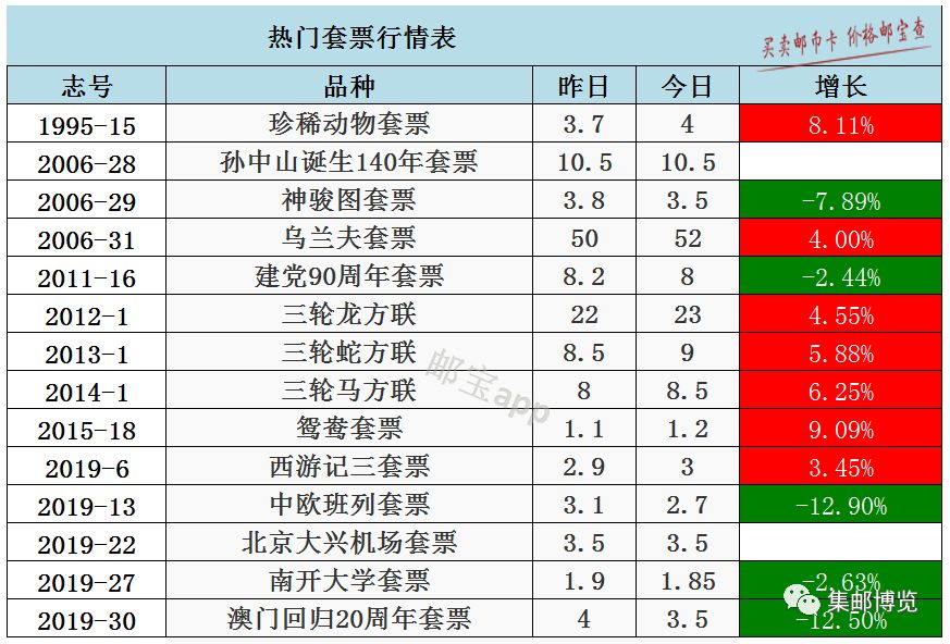 中欧班列套票今日最新价格为2.7元,昨日价格为3.1元,下跌12.9%。澳门回归20周年套票今日最新价格为3.5元,昨日价格为4元,下跌12.5%。