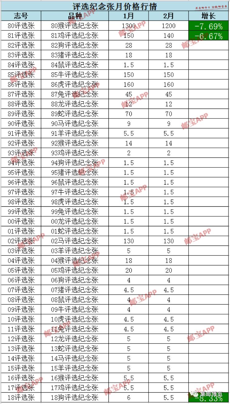 价格变化的产品有: 18狗评选纪念张1月行情为6元,2月价格为5.5元,下跌8.33%。 80猴评选纪念张1月行情为1300元,2月价格为1200元,下跌7.69%。 81鸡评选纪念张1月行情为150元,2月价格为140元,下跌6.67%。 更多品种价格变化请见下表