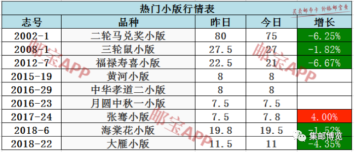 梅花小型张昨日行情为110元,今日价格为115元,上涨4.55%。