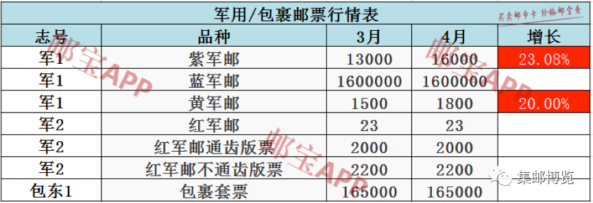 黄军邮上月行情为1500元,本月最新行情为1800元,上涨20.00%。