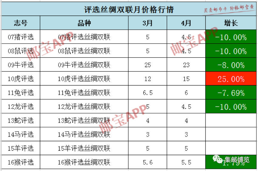08鼠评选丝绸双联上月行情为5元,本月价格为4.5元,下跌10.00%。