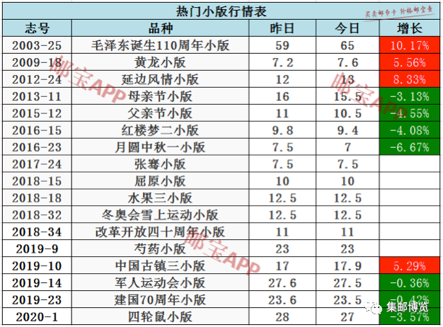 毛泽东诞生110周年小版昨日行情为59元,今日最新价格为65元,上涨10.17%。延边风情小版昨日行情为12元,今日最新价格为13元,上涨8.33%。黄龙小版昨日行情为7.2元,今日最新价格为7.6元,上涨5.56%。中国古镇三小版昨日行情为17元,今日最新价格为17.9元,上涨5.29%。月圆中秋一小版昨日行情为7.5元,今日最新价格为7元,下跌6.67%。父亲节小版昨日行情为11元,今日最新价格为10.5元,下跌4.55%。红楼梦二小版昨日行情为9.8元,今日最新价格为9.4元,下跌4.08%。