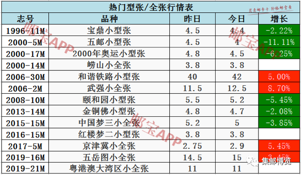 武强小全张昨日行情为11.5元,今日最新价格为12.5元,上涨8.70%。京津冀小全张昨日行情为2.75元,今日最新价格为2.9元,上涨5.46%。和谐铁路小型张昨日行情为40元,今日最新价格为42元,上涨5.00%。五邮小型张昨日行情为4.5元,今日最新价格为4元,下跌11.11%。2000年奥运小型张昨日行情为4.8元,今日最新价格为4.5元,下跌6.25%。颐和园小型张昨日行情为5.5元,今日最新价格为5.2元,下跌5.46%。