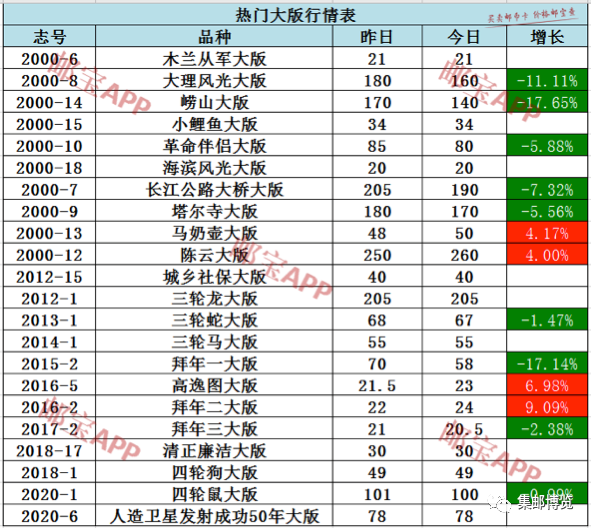 拜年二大版昨日行情为22元,今日最新价格为24元,上涨9.09%。高逸图大版昨日行情为21.5元,今日最新价格为23元,上涨6.98%。马奶壶大版昨日行情为48元,今日最新价格为50元,上涨4.17%。陈云大版昨日行情为250元,今日最新价格为260元,上涨4.00%。崂山大版昨日行情为170元,今日最新价格为140元,下跌17.65%。拜年一大版昨日行情为70元,今日最新价格为58元,下跌17.14%。大理风光大版昨日行情为180元,今日最新价格为160元,下跌11.11%。长江公路大桥大版昨日行情为205元,今日最新价格为190元,下跌7.32%。革命伴侣大版昨日行情为85元,今日最新价格为80元,下跌5.88%。塔尔寺大版昨日行情为180元,今日最新价格为170元,下跌5.56%。