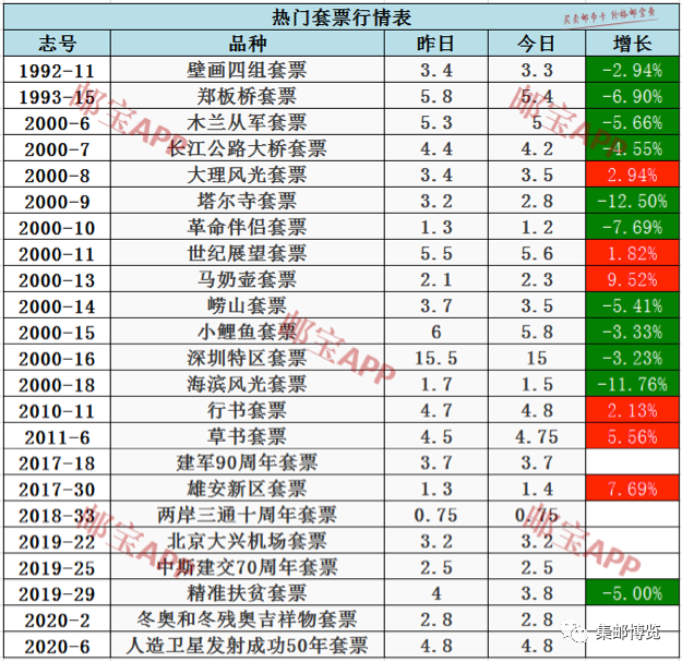 马奶壶套票昨日行情为2.1元,今日最新价格为2.3元,上涨9.52%。雄安新区套票昨日行情为1.3元,今日最新价格为1.4元,上涨7.69%。草书套票昨日行情为4.5元,今日最新价格为4.75元,上涨5.56%。塔尔寺套票昨日行情为3.2元,今日最新价格为2.8元,下跌12.50%。海滨风光套票昨日行情为1.7元,今日最新价格为1.5元,下跌11.76%。革命伴侣套票昨日行情为1.3元,今日最新价格为1.2元,下跌7.69%。郑板桥套票昨日行情为5.8元,今日最新价格为5.4元,下跌6.90%。木兰从军套票昨日行情为5.3元,今日最新价格为5元,下跌5.66%。崂山套票昨日行情为3.7元,今日最新价格为3.5元,下跌5.41%。精准扶贫套票昨日行情为4元,今日最新价格为3.8元,下跌5.00%。长江公路大桥套票昨日行情为4.4元,今日最新价格为4.2元,下跌4.55%。