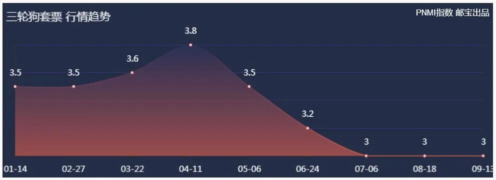 三轮狗套票1月至4月都处于上涨趋势,从1月的3.5月缓涨至4月的3.8元,5月开始逐月下跌,5月跌至3.5元,6月跌至3.2元,7月再跌至低点3元。8至9月维持着7月的均价,相比1月下跌14.29%。