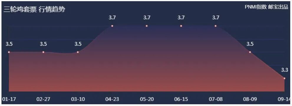 三轮鸡套票从1至3月的均价都为3.5元,4至7月涨至3.7元,8月再次回调至3.5元,9月再跌至低点3.3元,相比1月下跌5.71%。