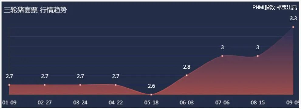 三轮猪套票上半年都波动甚小,1至4月都保持在2.7元,5月跌至2.6元。6月开始从2.8元一直涨到9月的3.3元,相比1月上涨22.22%。