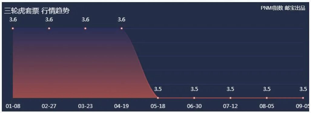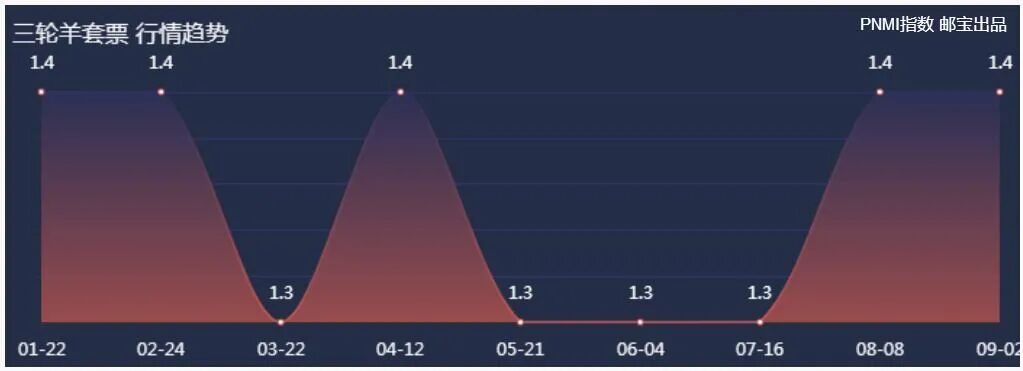 三轮鼠套票从年初到7月都波动较小,从1月的3.7元跌至2至3月的3.6元。4至7月都维持在3.5元没有变化,8月大跌至3元,9月也是均价3元,相比1月下跌18.92%。