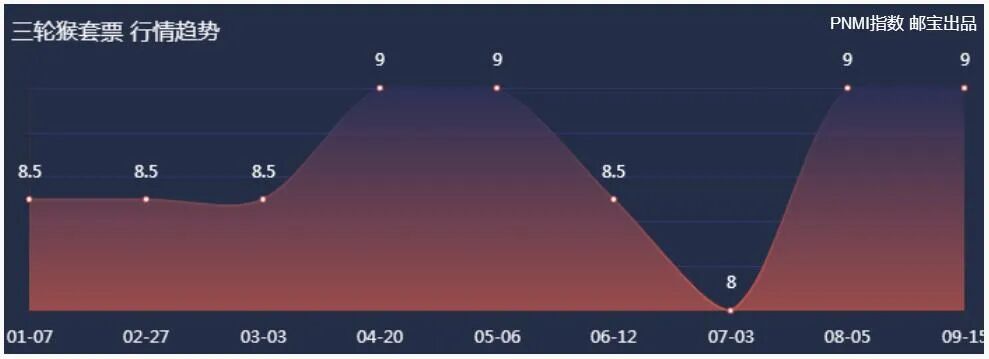 三轮猴套票1至3月都保持在8.5元的价格,4月涨到5元,5月保持4月的价格。6月跌至8.5元,7月再跌至低点8元,8月涨至9元,9月维持8月价格,上涨5.88%。