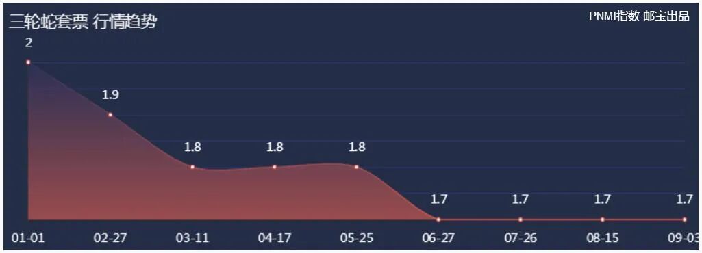 三轮蛇套票1月均价2元,2月跌至1.9元,3月再次下跌至1.8元后维持到5月。6月再跌至1.7元,7至9月都维持着6月的均价,相比1月下跌15%。