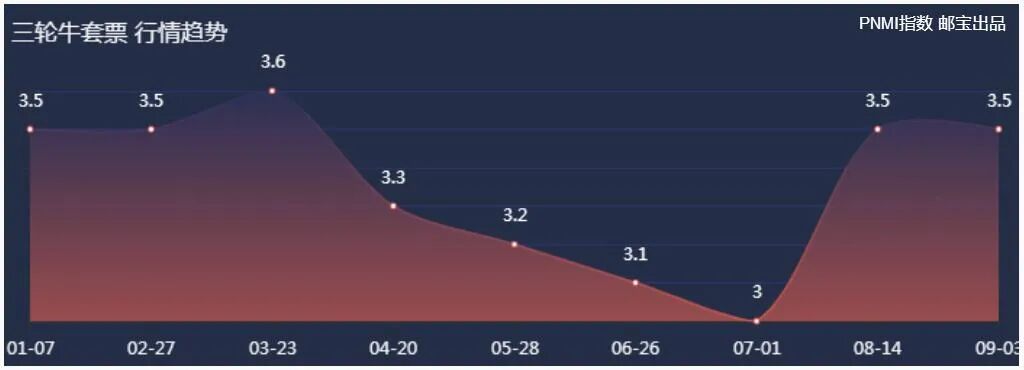 三轮牛套票1至2月保持均价3.5元,3月涨到3.6元后逐月下跌至7月的3元,但8月回涨至3.5元,9月维持8月的价格,但是相比1月价格持平。