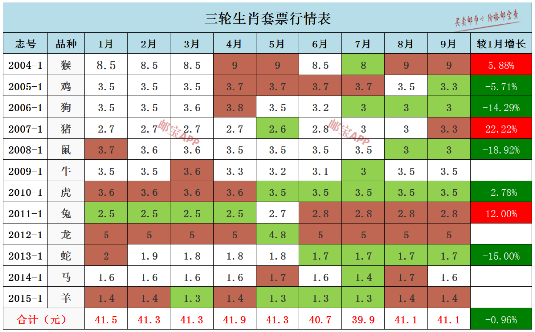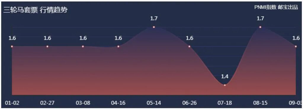 三轮马套票1至4月保持均价1.6元,5月涨至1.7元,6月跌至1.6元,7月跌至低点1.4元,8月回弹至1.7元后再次跌至9月的1.6元。相比1月没有变化。