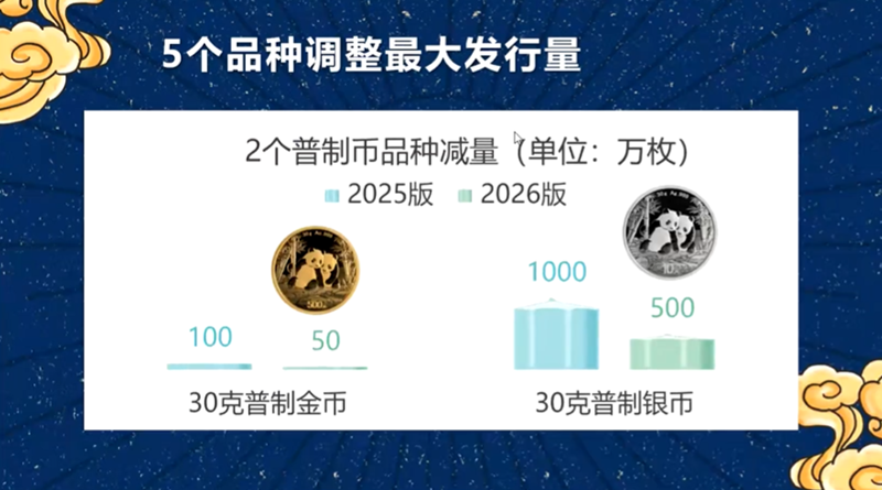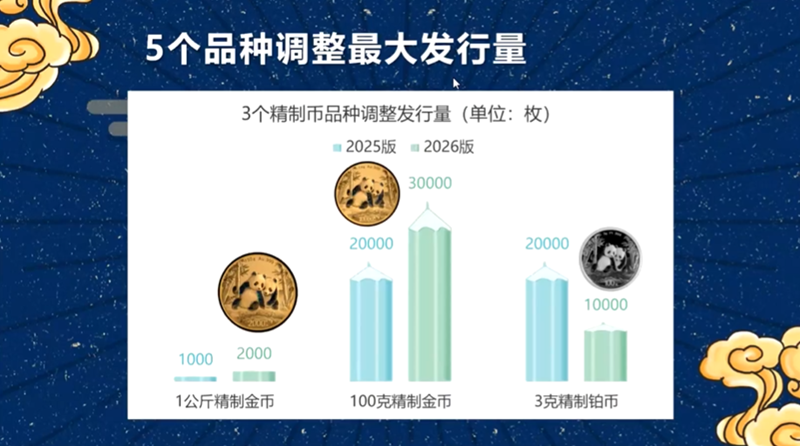 在最大发行量设置方面,2026版熊猫贵金属纪念币共对5个品种进行了调整。一是对普制币的两个品种进行了减量:30克普制金币从2025版的100万枚调减为50万枚,30克普制银币从2025版的1000万枚调减到500万枚,使发行量更贴近于实际销售情况,同时也保留一定的增长空间;二是对精制币涉及的三个品种进行了调整:1公斤精制金币从2025版的1000枚增加到2000枚,100克精制金币从2025版的2万枚增加到3万枚,3克精制铂币由2万枚缩减至1万枚。其中,1公斤和100克精制金币的发行增量主要是基于当前供不应求的市场现状,从而更好地满足集藏爱好者的收藏与投资需求;而3克精制铂币的发行缩量则旨在进一步强化其收藏属性。
