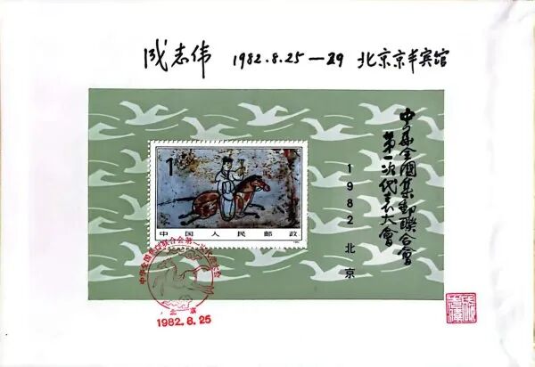 为庆祝中华全国集邮联合会第一次代表大会召开,邮电部于大会开幕日发行J85M《中华全国集邮联合会第一次代表大会》小型张,由邮票设计家刘硕仁设计,图案为“甘肃嘉峪关魏晋时期墓室壁画——驿使图”。每位参会代表均收到一个大会纪念邮折,邮折上贴有这枚新发行的小型张。刘硕仁还设计了大会纪念戳,并特意写了一段文字说明,这些邮票、邮品我都珍藏至今。