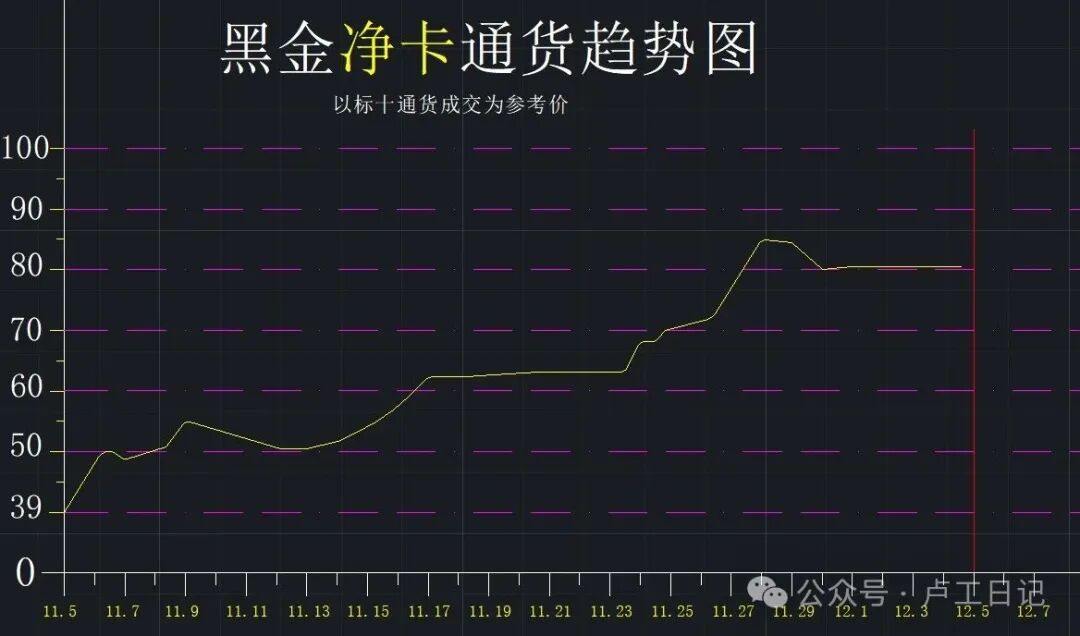 今日黑金旦卡成交放量,卢工市场中成交近千枚的数量,前天黑金旦卡号码88801标百以21万元成交,平均2100元/枚的价格,靓号就是牛逼啊,想当初获奖黑金卡无347号码这个级别的单枚价格也曾到达过这个价格,如今已回落在600~700元之间,黑金神话那时是真辉煌呀,旦卡通货在60元左右,无4在75元左右。黑金净卡期货在盘整中,通货标十在80元左右,标百在90元左右,获奖黑金卡散卡零售在200元成交,标十在2200元,