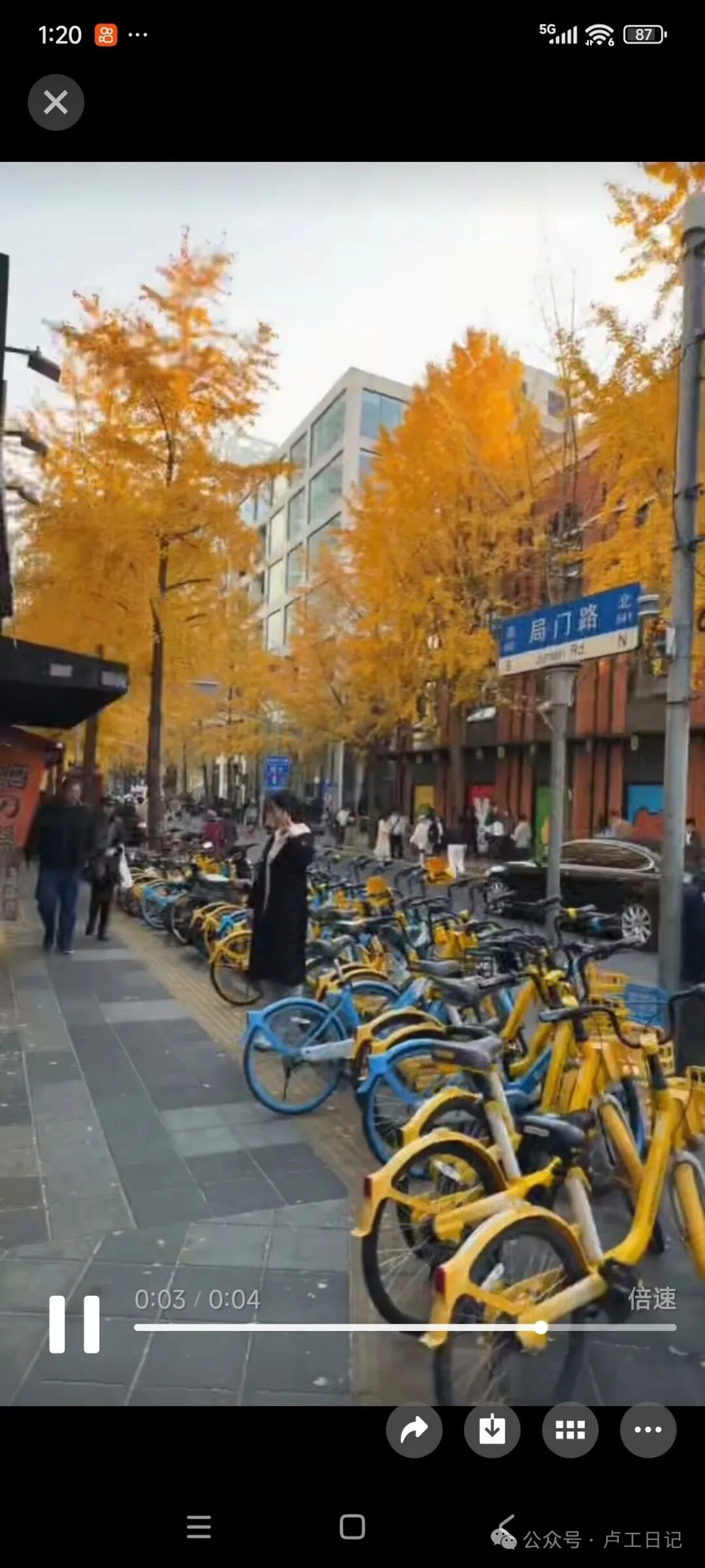 今天是周日,卢工市场上人流较多,不光是今天?这2天的人流都比平常多一些,原因是卢工市场门前一条街上银杏树变成了金黄色,局门路成了旅游打卡的风景一条街了。