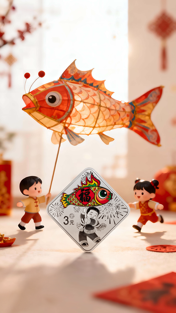 8克银币的主体图案以“孩童舞鱼灯”为核心场景,这一民俗缘自徽州,是当地传统民俗和非物质文化遗产瑰宝。人们通过载歌载舞的方式迎接农历新年的到来。图案上,孩童的造型圆润饱满,脸上洋溢着欢快、喜悦的笑容,仿佛有使不完的劲儿。他上方的鱼灯被创造性地贴上了“福”字,通过局部彩喷工艺的运用,以红色、黄色、橙色、绿色等鲜艳色彩精准复刻了鱼灯的原貌,传递出年年有余的祝福。颇具亮点的是,这是首次在贺岁银币上使用多种颜色来表现图案。整个设计兼顾了传统文化的表达与民俗场景的刻画,年味十足,极富感染力,在彰显文化价值的同时,也为大众提供了情绪价值。