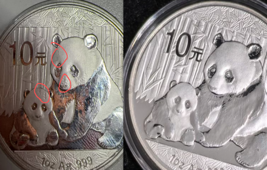 而图中假币由于翻模精度不足,出现眼眶变形、瞳孔偏移等问题,看上去像是“斜视”或“斗鸡眼”。更严重的是,部分低劣仿品连基本的浮雕比例都失衡,小熊猫头部过大或过小,破坏了整体美感。
