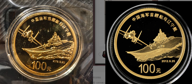 图示纪念币于2012年发行,旨在纪念中国首艘航空母舰正式服役,包含金、银各两枚,属重大题材作品。其设计严谨,数据精确,连航母甲板上的舰载机起降线都按真实比例还原。