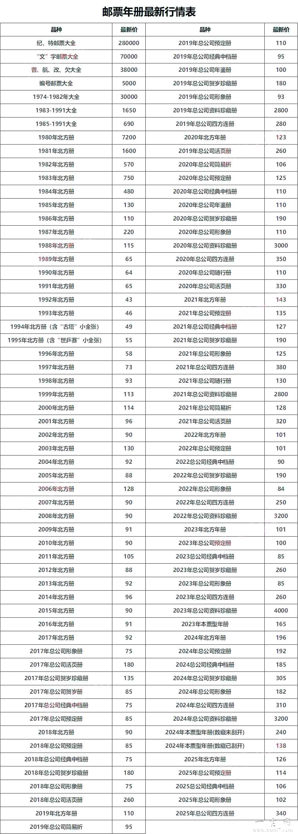 邮票年册最新行情表